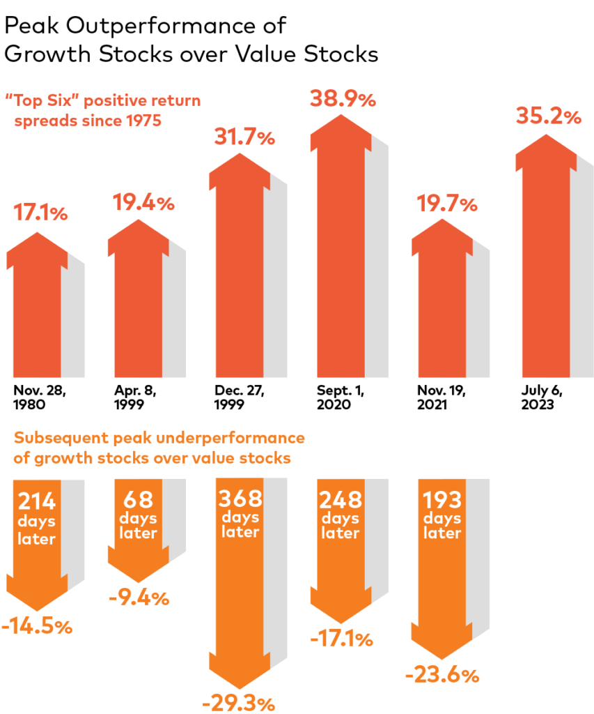 Source: AGF Investments using data from Bloomberg LP. Rolling six-month performance spread between MSCI U.S. Growth Index and MSCI U.S. Value Index. Full data set of research calculated from January 1, 1975 to July 31, 2023. Past performance is not indicative of future results, one cannot invest directly in an Index.
