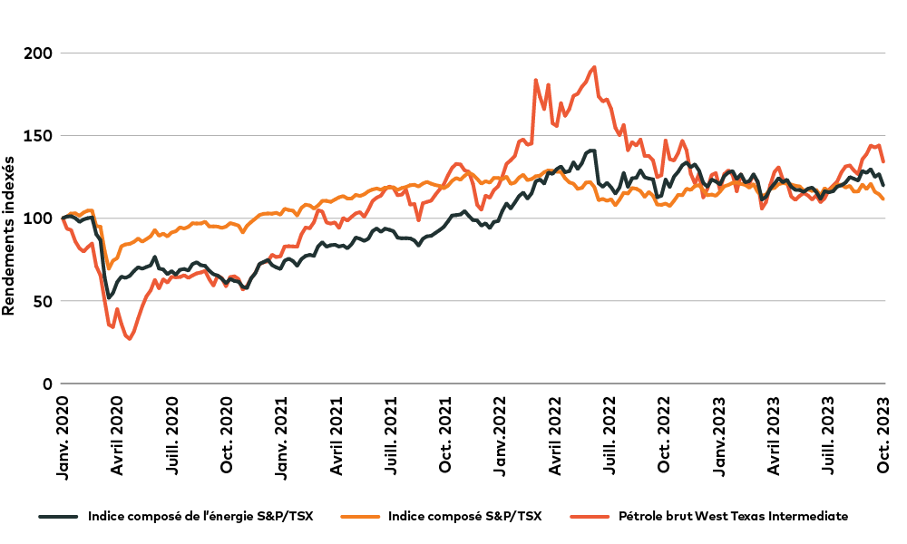 Cette tendance pourrait-elle se poursuivre? Le graphique ci-dessous suit l’évolution du prix du pétrole brut, de l’indice de l’énergie S&P/TSX et de l’indice composé S&P/TSX, tous indexés à la date de début du 1er janvier 2020. Malgré l’effondrement des marchés à la fin du premier trimestre de 2020, les trois placements ont inscrit un rendement de plus de 18 % jusqu’en septembre de cette année; le pétrole brut a mené le bal, en hausse de 38 %, et les actions du secteur de l’énergie ont progressé de 26 %, surpassant ainsi le rendement de l’indice S&P/TSX au cours de cette période. La volatilité des prix du pétrole a été élevée au cours de la période de quatre ans; elle s’était effondrée durant la pandémie de COVID-19, avant d’atteindre un sommet au premier semestre de 2022, lorsque la guerre entre la Russie et l’Ukraine a commencé. Les actions du secteur de l’énergie ont affiché un rendement nettement supérieur pendant la reprise économique de 2021 et le début de la guerre en 2022, et elles font du surplace depuis les 18 derniers mois.