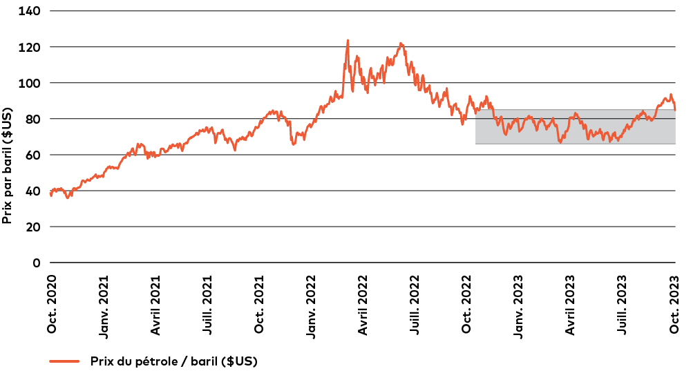 Au cours des huit premiers mois de 2023, les prix du pétrole se sont maintenus dans une fourchette de négociation en dents de scie, oscillant entre 66 $US et 83$ US le baril jusqu’à tout récemment. En septembre, le prix du pétrole a grimpé, clôturant le troisième trimestre à un peu plus de 90 $US le baril et risquant d’atteindre des niveaux plus élevés au quatrième trimestre.