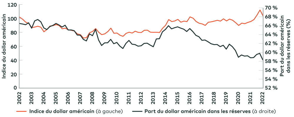 En fait, il y a lieu de croire que cette situation se manifeste déjà (voir le graphique 1). Prenons l’exemple de la part du dollar américain dans les réserves de change. Celle-ci a constamment reculé pendant la plus grande partie des deux dernières décennies, mais au cours de la même période, l’indice du dollar américain – qui classe le billet vert par rapport à un panier de six autres devises – est demeuré relativement stable et a augmenté depuis 2010.
