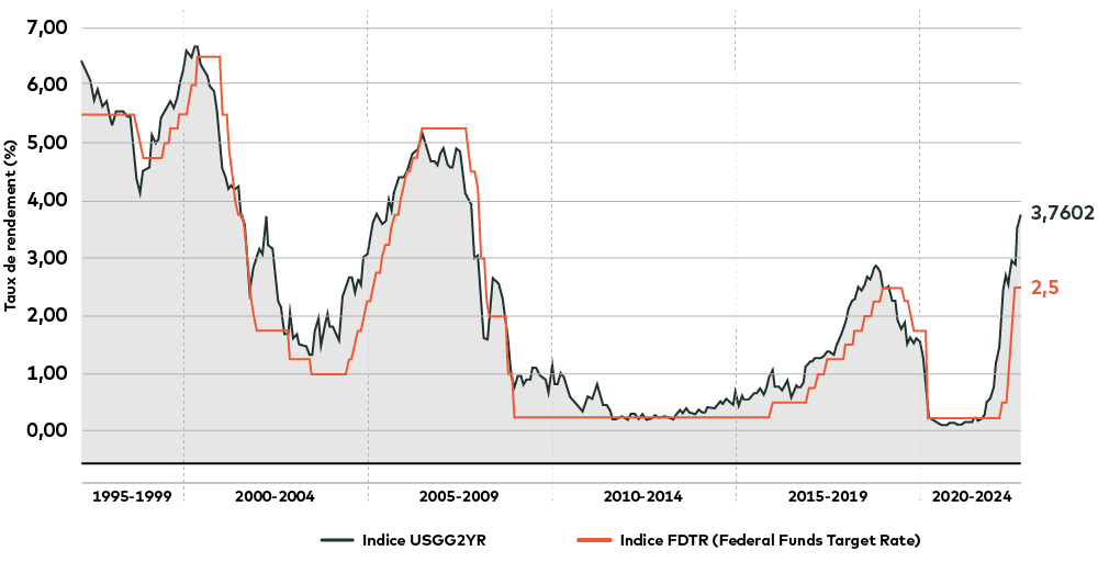 Figure 1 : Taux des obligations du Trésor à 2 ans et taux des fonds fédéraux