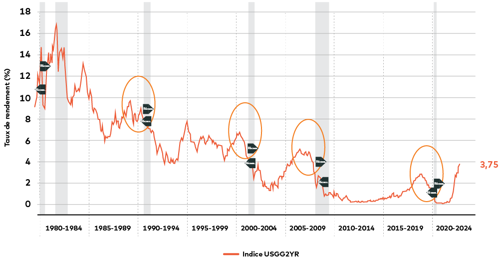Figure 3 : Taux des obligations du Trésor à 2 ans et récessions
