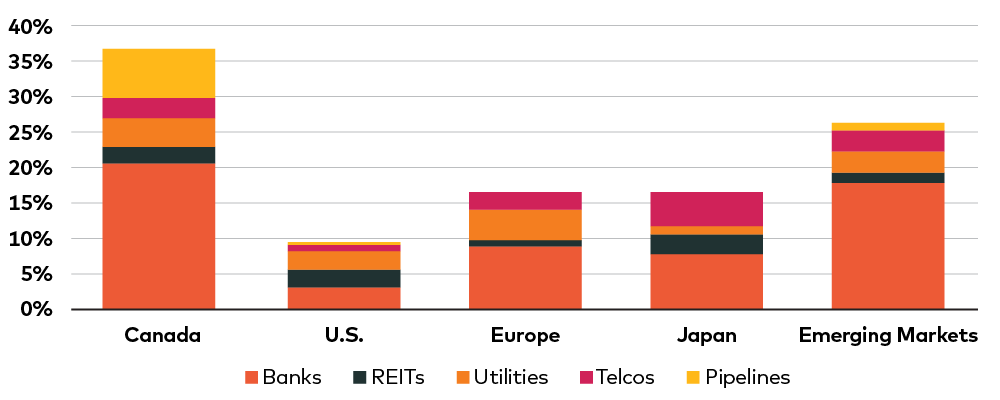 Source: AGF Investments using Bloomberg LP data as of October 10, 2024. Interest-sensitive sector weightings established using the following global indexes: S&P/TSX Composite Index (Canada), S&P 500 Index (U.S.), MSCI Europe Index (Europe), MSCI Japan Index (Japan), MSCI Emerging Markets Index (Emerging Markets).  One cannot invest in an index. Past performance is not indicative of future results.