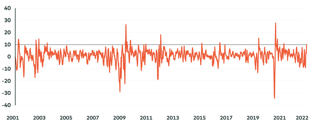 Source: AGFiQ using data from FactSet as of August 10, 2022. One-Month rolling return of stocks in the top quintile based on the respective factors in the top 1,200 securities in the U.S. by market cap.