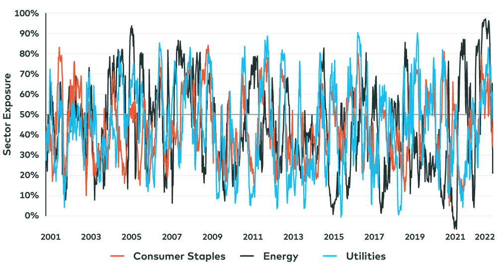 In the previous blog of this series, momentum stocks were highlighted for their extreme volatility as well as their makeup as it relates to underlying factors. Since then, the performance of momentum stocks has normalized – especially when considering changes over a three-month period. For example, momentum’s exposure to the consumer discretionary and information technology sectors was abnormally low earlier this year, but has almost returned to normal and could be moving towards an opposite extreme of abnormally high exposure to these sectors in the short term (see illustration 2). Similar dynamics are in play for sectors like consumer staples, utilities and energy, albeit in reverse. Instead of moving from low-to-high, momentum exposure to these sectors has fallen dramatically from where it was just a few months ago.