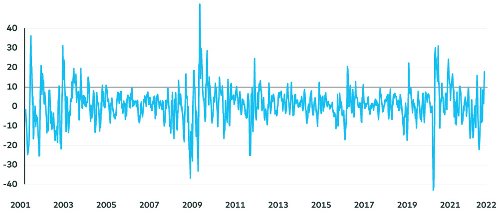 The rally in U.S. stocks from mid-June to mid-August was led by a slew of risk-on names, including small capitalization, low-quality, high-volatility growth companies that outperformed the broader market by roughly 10% on average near the end of July (see illustration 1) and closer to 20% in early August, according to AGFiQ research. But large capitalization, high-quality stocks that are normally associated with more risk-averse positioning did almost as well throughout this period. Moreover, the returns of these two trades at opposites ends of the risk spectrum can be considered extreme based on their larger-than-average deviation from historical performance spreads to the broader market.