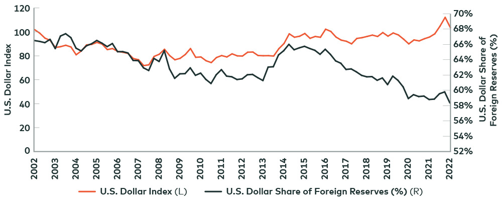In fact, this may already be evident (see chart 1). Take the U.S. dollar’s share of foreign exchange reserves, for example. It has steadily declined for the better part of the past two decades, yet over that same period, the U.S. Dollar Index – which ranks the greenback against a basket of six other currencies – has remained relatively stable and increased since 2010.