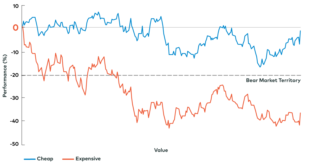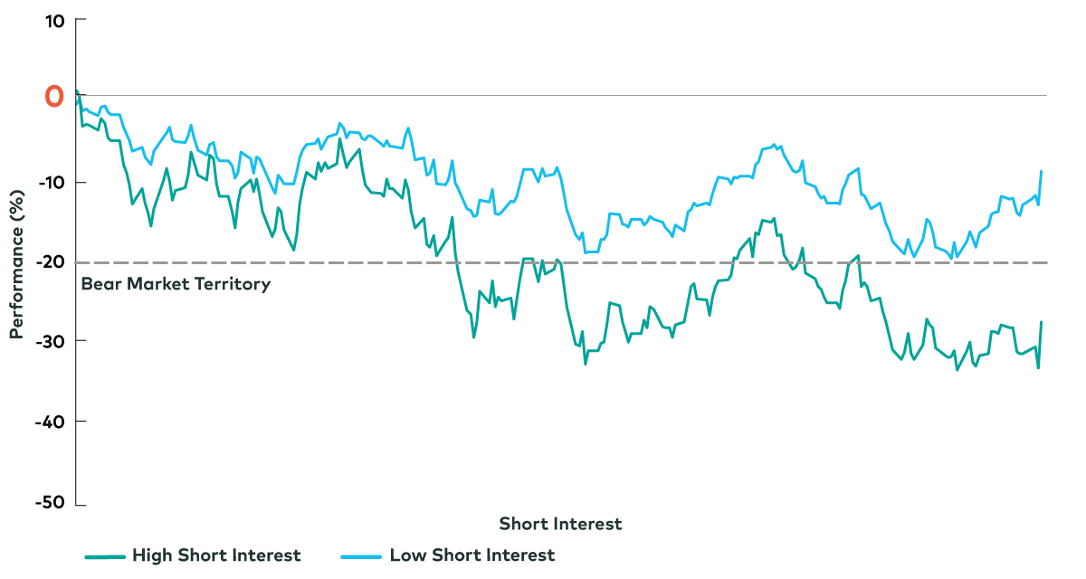 For instance, U.S. equities deemed expensive (from a value perspective) or low quality are among the most oversold, as are those characterized as high-beta names and those that attract the most short-selling interest from investors (see chart 1). In each of these cases, losses have been far more than the broad U.S. equity market, which has been down as much as 25% and fallen into bear market territory on two separate occasions year-to-date.