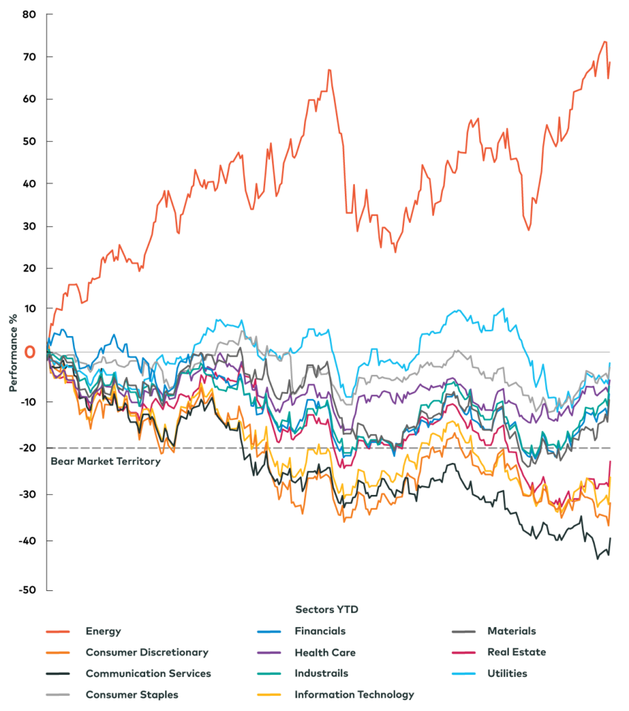 Source: AGFiQ using data from FactSet as of November 10, 2022. Cumulative year-to-date returns of sectors within the largest 1,200 securities in the United States.